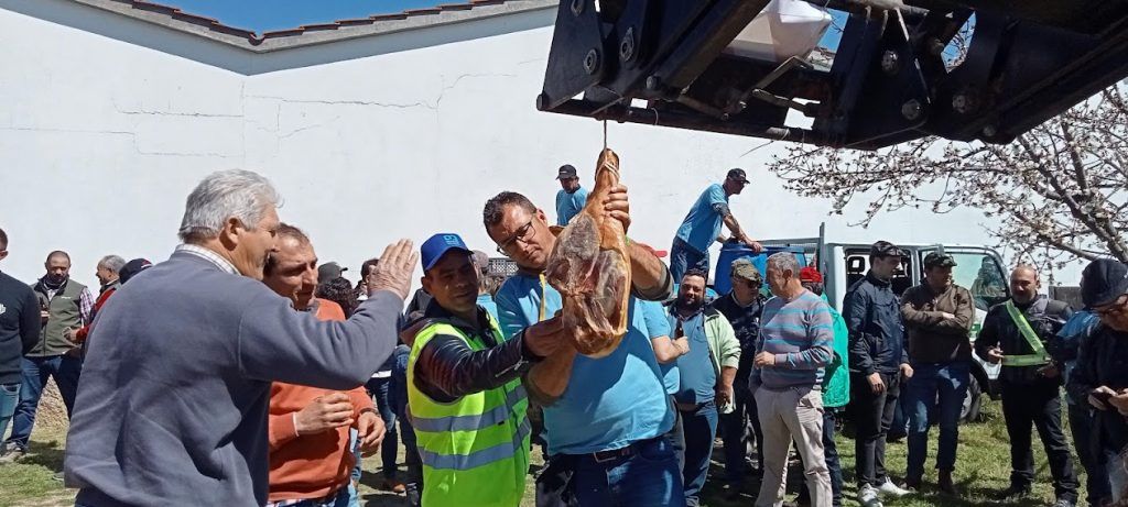Cá fora houve quem não resistisse ao malogrado presunto que desde o início da prova circulava pendurado no balde do último trator. Navalhinha afiada, lasca por lasca, era só levar a carcaça já aberta e cortar para cima…